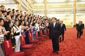 演出開始前,習近平等黨和國家領(lǐng)導人會見了文藝會演演職人員代表、組委會成員、56個民族的優(yōu)秀基層黨員代表等,并同他們合影留念。
