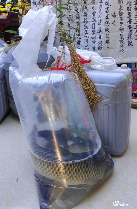 這幅圖片拍攝于都勻殯儀館,是在一位水族干部的葬禮上,三都水族自治縣九阡鎮(zhèn)的內(nèi)侄們從家鄉(xiāng)趕來憑吊姑父時,送來了三條大活魚、一頭小豬、一壺米酒等物。水族有忌葷不忌魚的習(xí)俗,內(nèi)侄送魚表示與表兄弟姊妹一道忌葷,共同戴孝,共同守制;送來的小豬為堂祭犧牲,祭奠亡人。