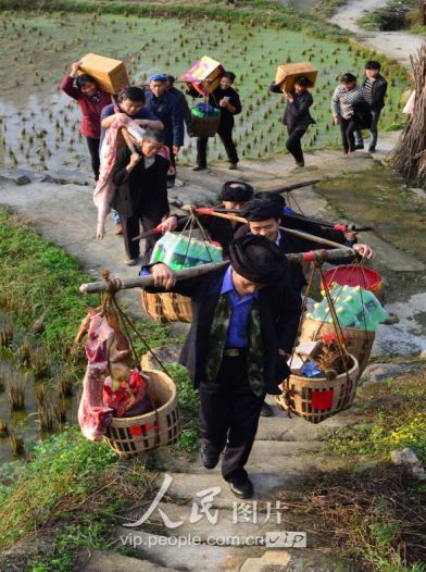 11月17日,新娘家的親戚朋友挑著賀禮前往新娘家慶賀。