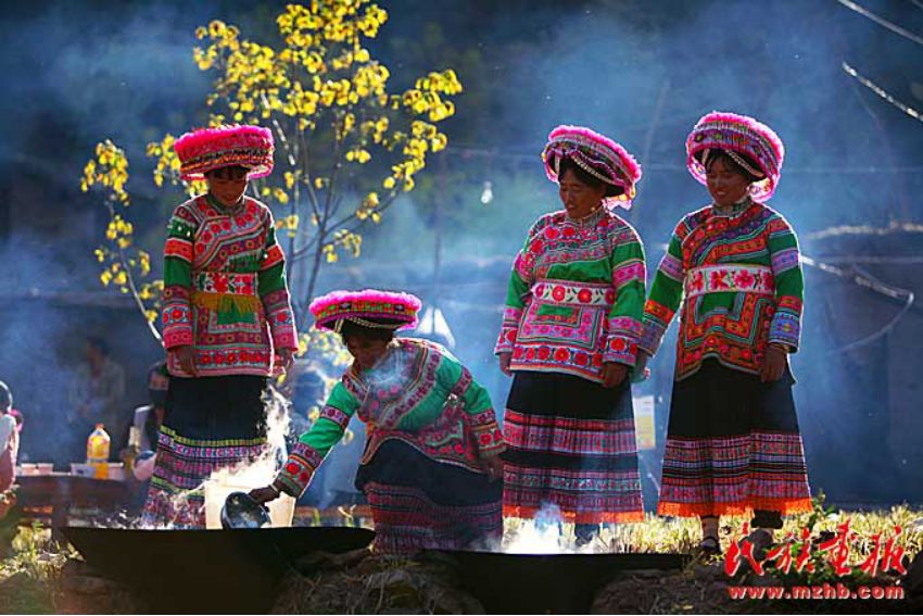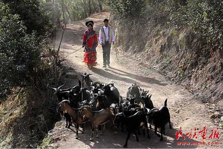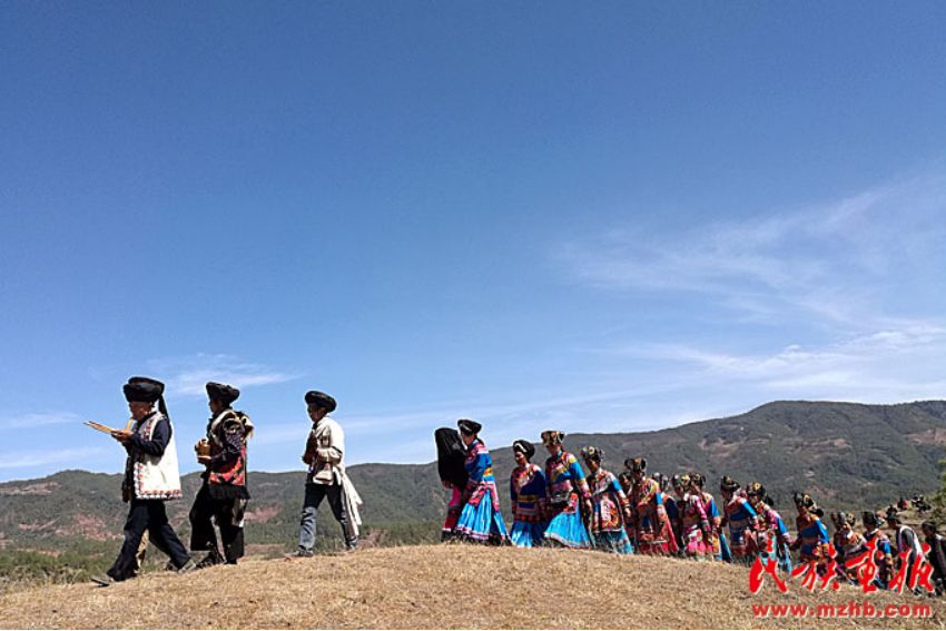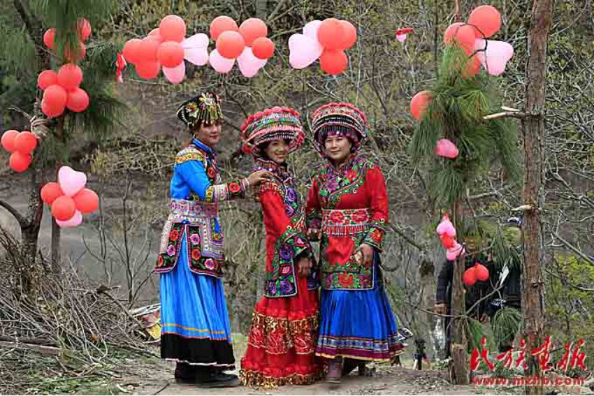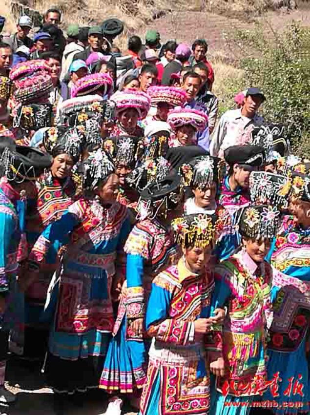 娶親要請客,當?shù)乩圩逭埧椭恍杩陬^傳話,凡是知道的親戚朋友都會來參加。娶親隊伍主次兩位主婚人,伴郎伴娘各一人,背新娘和嫁妝的二人,接親的四至六人,其中有一至兩個歌手,一行十二人組成。帶著早已為新娘準備好的花短衣、長裙、銀手飾、圍腰鏈、銀泡、銀項等飾物興高采烈地從新郎家出發(fā)。