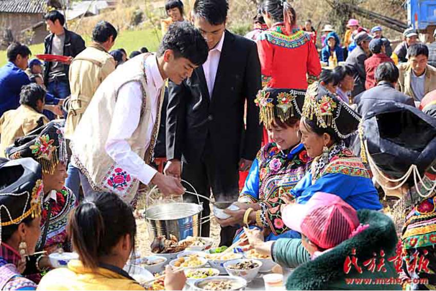 穿長衫,戴著包頭的新郎,把新娘接入正堂屋,將送親的人群迎進臨時搭建的青棚屋休息。青棚,是傈僳族人辦婚事時砍來毛櫟樹、香樹枝等臨時搭起的棚子。既清新又涼爽舒適??梢杂脕斫哟e客,也可以作為跳舞、唱曲子的活動場所。晚餐就在青棚里進行,宴席一般不用桌子,酒菜擺在青棚下面鋪好青松毛的地上,客人八個一圈,席地坐在青松毛上,圍著喜筵,既歡樂又開心的喝著美酒、品嘗佳肴。晚飯菜肴十分豐盛,足見主人家的好客和廚師的高超手藝。菜出雙不出單,菜的顏色出紅不出白。一切都象征著成雙成對,吉祥如意。