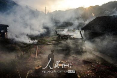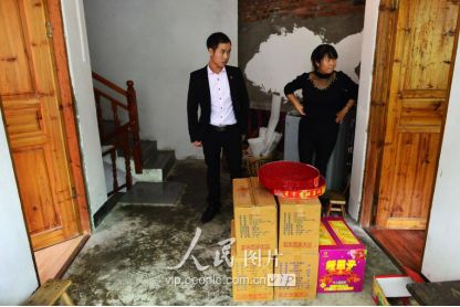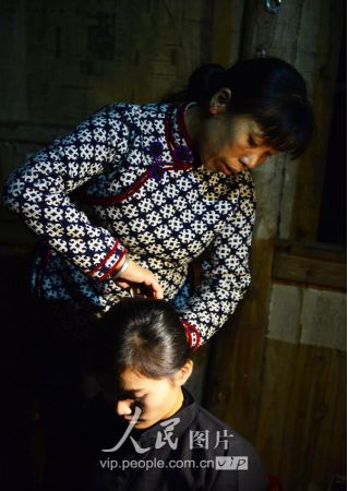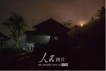 一般要到快過春節(jié)的時候,男方家才專門請人去接女方來洗糯米、打糍粑,新娘方能在夫家住上一夜;在來年農忙時節(jié),又接女方來幫忙,夜里仍不能在男方家留宿,幫完忙當晚即回去,只有待到女方有身孕后,新娘才到夫家長住。圖為11月16日夜,新娘潘芝銀家為準備婚禮,燈火徹夜長明。