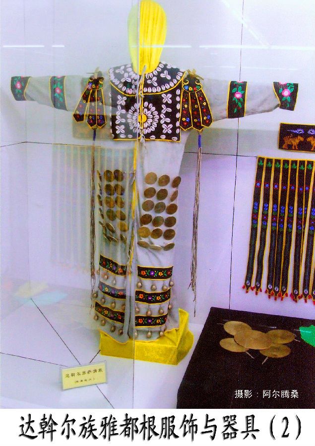 在達(dá)斡爾族人部分轉(zhuǎn)向農(nóng)業(yè)生產(chǎn)后,他們的觀念意識(shí)也發(fā)生了一些變化,雅德根服飾隨之有所演變,雙肩的鳥使者為布谷鳥所替代,成為春天的使者,神肩上360個(gè)海貝飾品表示360天,24條長(zhǎng)短飄帶象征農(nóng)歷的24個(gè)節(jié)氣 。