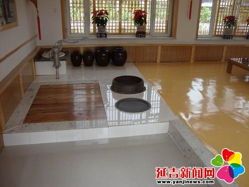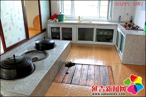 在傳統(tǒng)的朝鮮族民宅中,炕和鍋臺(tái)是平齊的,需要燒火做飯時(shí),主婦會(huì)打開(kāi)架在柜臺(tái)一側(cè)的移動(dòng)木板,下到地面水平線以下的“灶坑”點(diǎn)火做飯。傳統(tǒng)的炕采用長(zhǎng)筒式結(jié)構(gòu),煙火由一洞內(nèi)循環(huán)排出,使每洞都有煙火串入,炕即溫?zé)帷3r族的火坑高度為30-40厘米,但炕洞向下挖入,炕面抹白灰,表面糊油紙或鋪草簾子,炕面平整。隨著物質(zhì)條件的改善,炕面改鋪纖維板或者地板膠,既美觀又耐用。