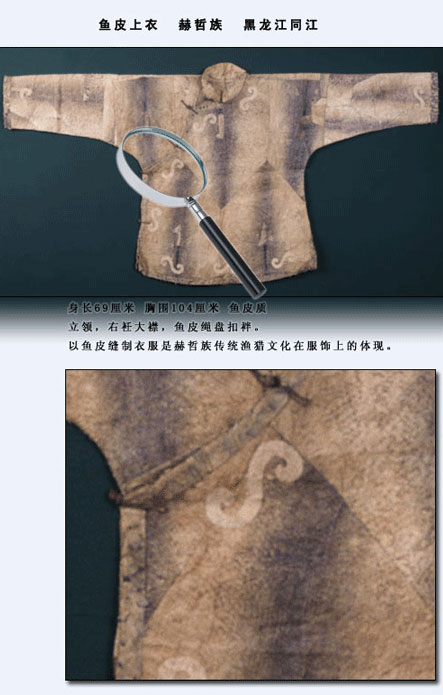 赫哲族的魚皮衣歷史久遠。我國古代文獻《山海經(jīng)》第九卷《海外東經(jīng)》中便有“玄股之國,在其(黑齒)北,其為人衣魚食鷗” 的記載。“衣魚”西晉學者郭璞解釋為“以魚皮為衣也?!闭f明早在兩千多年前,赫哲族的先民就已使用魚皮做衣服了。另據(jù)密山新開流新石器時代遺址中出土的魚叉及骨針,證明赫哲族的先民捕魚和縫制魚皮衣有數(shù)千年歷史了。清代張晉彥的《寧古塔山水記》有:“魚皮部落,食魚為生,不種五谷,以魚皮為衣,暖如牛皮”的記載?!痘是迓氊晥D》記載:“赫哲衣服多用魚皮而緣以色布,邊綴銅鈴,亦與鎧甲相似?!绷硗猓胤街緯鴮Υ艘捕嘤杏涊d??梢姡照茏逯谱骱痛┲~皮衣是真實而久遠的。