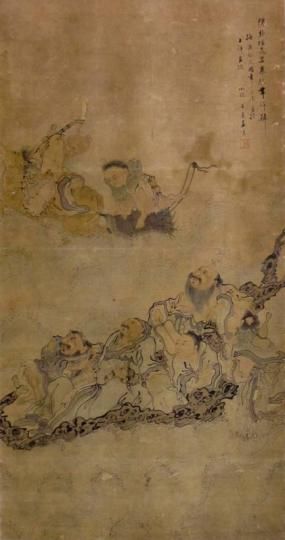 同時,展覽展出的八仙題材作品中,清代王素的《八仙圖》描繪了八仙過海的場景,八仙形象神態(tài)各異;清代蘇仁山的《李凝陽像》,則以墨筆描繪鐵拐李的背面,其身后背有斗笠和巨大的葫蘆,手持拐杖,作品構(gòu)圖獨特,線條流暢,人物形象簡拙。