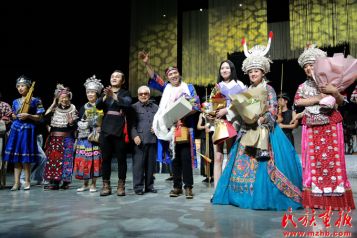 古樸的苗語、爵士的節(jié)奏碰撞出奇妙的藝術魅力。在第三篇章《未來的歌》中,《苗》《等待新娘》《NEW》《今宵醉》《苗嶺謠》《走了一山又一山》《干一杯》等曲目依次精彩上演,激情的旋律將本場音樂會推向高潮,現(xiàn)場觀眾深受感染。在蘆笙合奏《歡樂的苗家》歡快的旋律中,本場音樂會圓滿落下帷幕。
