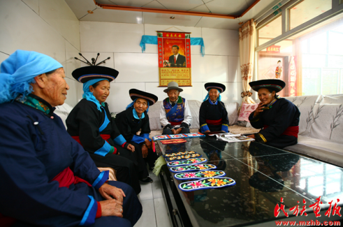 東溝村大莊村老年協(xié)會(huì)的土族老人們?cè)诮涣鞔汤C技藝 引自民族畫(huà)報(bào)