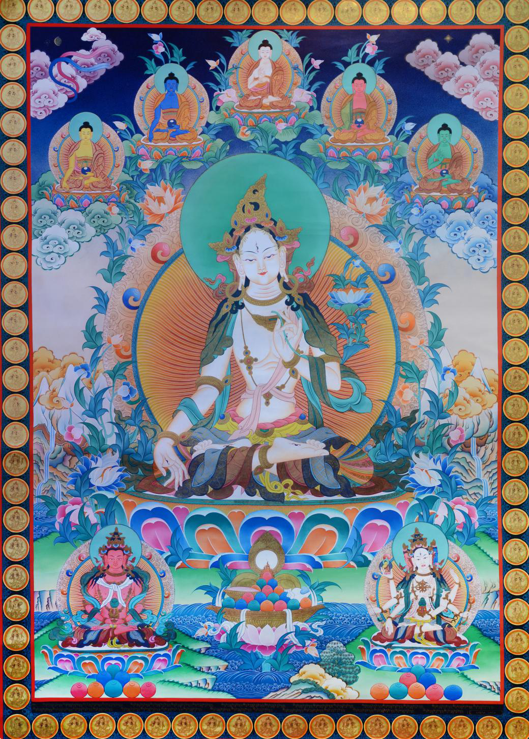 她的形象為一面二臂,面目端莊慈和,溫靜微笑,法相寂靜;頭戴花蔓冠,烏法挽髻,秀發(fā)后束,頂髻飄逸;雙耳墜著大環(huán),膚色潔白,玲瓏剔透,身放五光;穿麗質(zhì)天衣,上身袒露,頸掛珠寶瓔珞,斜披珞腋,身著五色天衣綢裙,以白珍珠為主的各種寶貝分別作為頭飾、耳飾、項飾、胸飾、腰飾、手鐲、腳釧,佩戴鈴串、天物之花,第一串繞頸,第二串繞胸,第三串繞臍,寶珠瓔珞遍體,細腰豐乳,如妙齡少女;上穿白絲,下著錦裙,全身花鬘莊嚴。七只慧眼個個如菊花花瓣大小,這些眼象征她能觀照一切眾生。月亮靠背,雙足金剛咖趺坐安住于蓮花月輪上,右手膝前手掌向外結(jié)施愿印以示救助,左手當胸以三寶印撫烏巴拉花,左手拇指與無名指牽住白蓮花枝對著心間,花沿腕臂至耳共有三朵,一朵含苞,一朵半開,一朵全開,代表佛、法、僧三寶具足;花莖曲蔓至耳際,形象典雅優(yōu)美。
