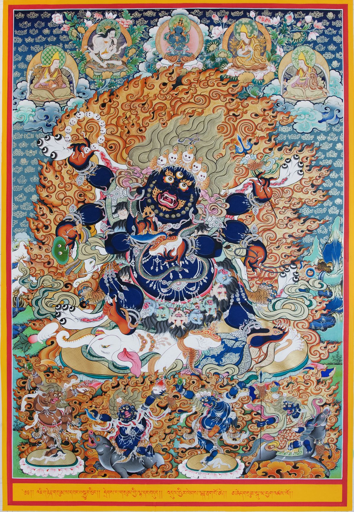 他面容猙獰恐怖,獠牙外露,三目圓睜怒視。頭發(fā)向上直立,眉間點有朱砂“仙都那”印記(梵文Sindura),象征一切空行之懷懾力量。頂戴五骷髏冠,項配五十新鮮頭顱。如果仔細(xì)觀看唐卡中護(hù)法頭部頂端,飾有一個小小的金剛杵,這是用來象征不動金剛。