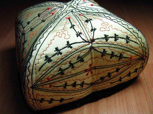 新疆兄弟民族的帽子,顏色、帽形是多種 多樣的,最典型的是維吾爾人的綠花帽。它是用手工、絲線(xiàn)繡上花葉圖案的四方棱形的花帽,繡工精致,花葉紋樣富有裝飾美。顏色有綠、紅、黃、黑、白。有單色的,也有無(wú)色交織的、黑白相間的。這種花帽,男女老少都愛(ài)戴,但顏色花樣有所不同。男士戴的多繡花,婦女戴的不但繡花,而且在花紋中鑲上玻璃珠子或碎玉石片。