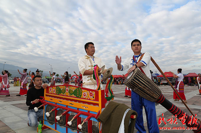 傣族小伙兒敲起傣族樂器象腳鼓及铓鑼、傣镲慶祝新年的到來(lái)