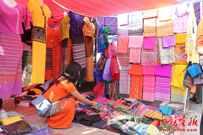 慶典活動(dòng)上人潮涌動(dòng),氛圍隆重。位于文化廣場(chǎng)的演出中心區(qū),傣族情歌對(duì)唱、孔雀舞表演、傣拳武術(shù)表演、傣劇等節(jié)目輪番上臺(tái)。在舞臺(tái)四周,一座座簡(jiǎn)易搭建的攤位前,賣有傣族服飾、貨品、傣文書籍等。街道兩旁的小吃一條街,擺有竹筒粑粑、撒撇、楂子、地瓜等特色美食。