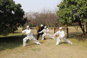 顏勇(中,穿黑衣者)指導(dǎo)回族青年習練晰揚掌