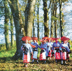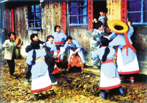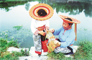 這是一個特別愛美的民族。男人們著裝瀟灑隨意,頭纏黑白相間的方格頭帕,倍顯英俊。女人們則身穿黛藍(lán)色對襟長衫,鑲著的紅布邊和紅布扣純?yōu)檠b飾。下著素艷相融的花裹裙,腰纏五顏六色的腰帶,頭上再配一個后面吊有長長彩須、狀似倒扣斗篷的火紅頭巾,把個茫茫綠野點綴得山花爛漫、如畫如詩。