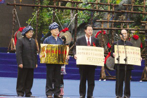 貴州省布依學(xué)會(huì)會(huì)長王思明(左一),向望謨縣授予“中國布依古歌之都”和“中國布依語言文字培訓(xùn)基地”之牌