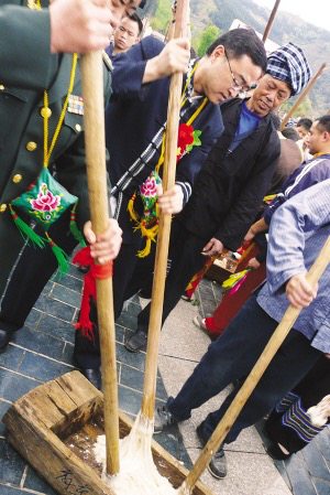 黔西南州委書記陳鳴明(中)與布依族同胞在活動(dòng)現(xiàn)場打糍粑