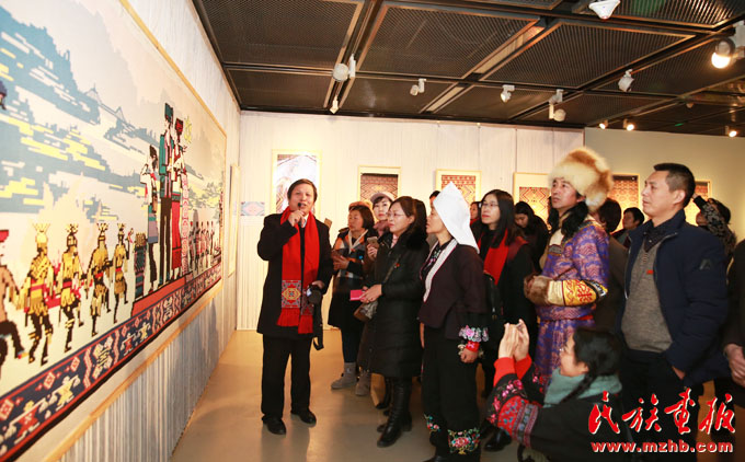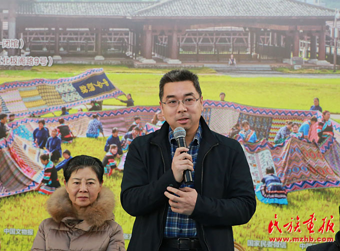 會上中國民族博物館黨委副書記、副館長張志文向少數(shù)民族作家們介紹了展覽,他說:“土家族是一個歷史悠久的民族,現(xiàn)在有835萬人口。土家織錦也有兩千多年的發(fā)展歷史,有250多種傳統(tǒng)圖案,是中國民間五大織錦之一,堪稱中國服飾文化中的奇葩。中國民族博物館從歷年征集收藏的300多幅清代以來的土家織錦中,選取了156幅精品土家織錦、21分鐘傳承人視頻和120余幅土家民族風(fēng)情照片。我們和中國婦女兒童博物館合作舉辦了這個高品質(zhì)的專題展,旨在傳承和弘揚土家族國家級非物質(zhì)文化遺產(chǎn)?!?/p>