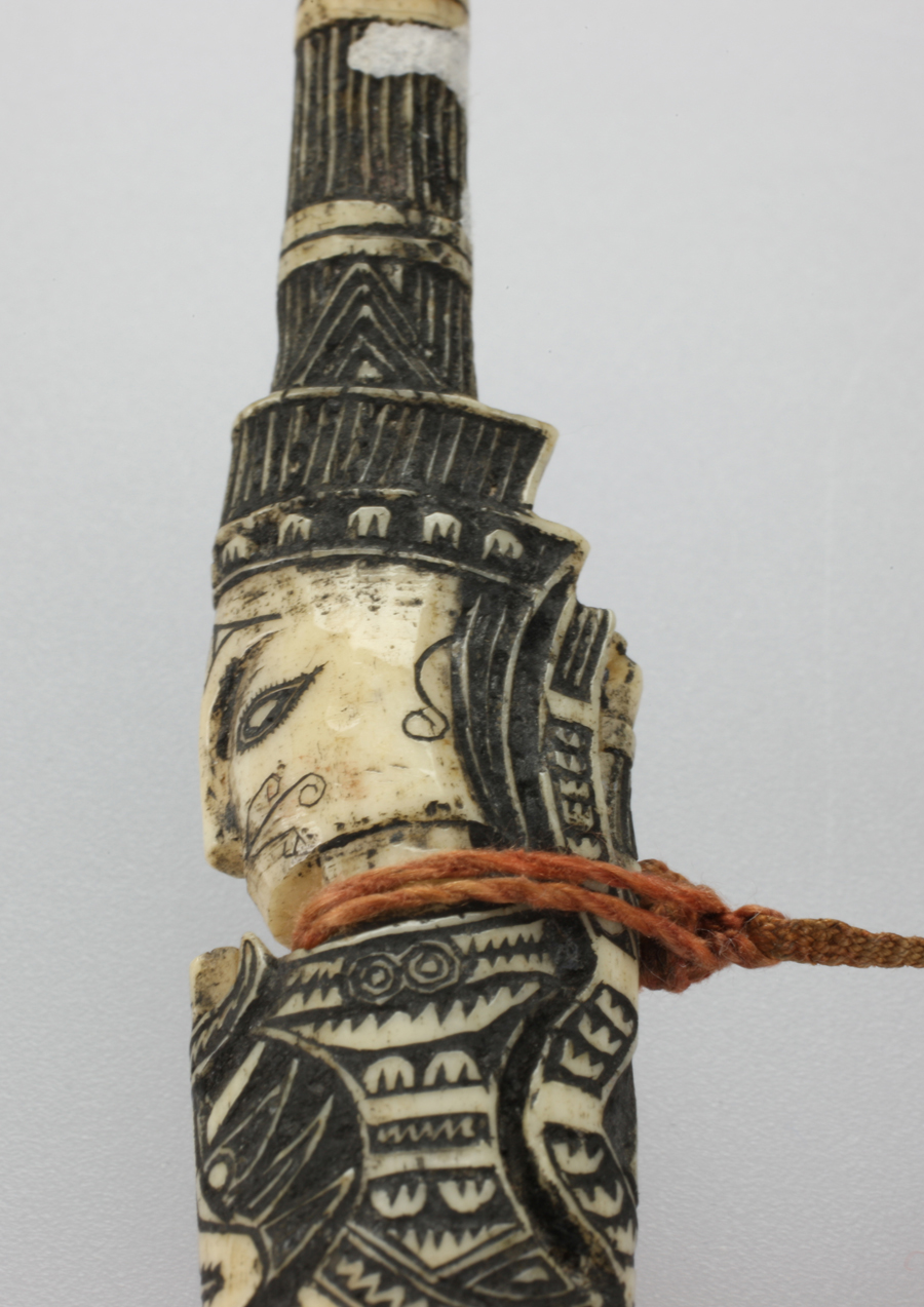 骨簪頭部以下是充滿幾何感的水波紋、山形紋、米字紋、圓形紋,留白之處有魚紋、花紋以及少許文字。文字或是雕刻者本人,或是其心愛之人。一般頭像處或中部系有幾束彩色料珠的紅纓穗飾物用以盤繞發(fā)髻上,或是以銀鈴、銀片來裝飾。