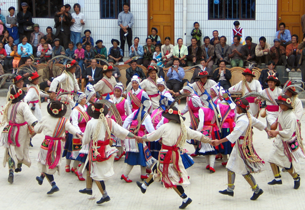 (3)再現(xiàn)日常生活的舞蹈。主要有姑娘舞,傈僳俗稱“斯匹羅吾”。系流行于云南怒江、麗江等地傈僳族地區(qū)的一種配樂器的民間舞蹈。伴奏樂器有琵琶、二胡、笛子、口弦等。這種舞蹈的突出特點(diǎn)是舞步輕快、靈巧,富于變化,舞姿輕盈優(yōu)美,生動形象。舞者多為數(shù)人,作手拉手或搭肩、撞臂等動作,且歌且舞,情緒歡樂、熱烈。