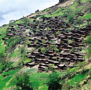 在怒江上游峽谷聚居的傈僳村寨都建在高山的半山上,其民居俗稱為“千腳落地房”。說“千腳落地”雖有些夸張,但也足以形象地說明峽谷溫?zé)岬臍夂蚝蜕礁咂露傅牡乩項l件。在雨季時,“千腳”阻力最小,使山洪順利傾瀉而下,又很快干爽,免受潮氣。而且不需挖地動土,不必移石砌墻,對木料沒有過高要求,長短皆用,在生態(tài)脆弱的高山峽谷也算環(huán)保建筑?!扒_落地”是因建房時先在確定的屋基上依斜坡程度和住房面積打進數(shù)十根到百余根木樁為基樁,以保證居室樓板的平正?;鶚洞蚝煤?,除四面留幾根高柱作為整個房屋的立柱外,在密集木樁所形成的平面上滿鋪竹篾編織的樓板,還有竹篾圍墻,所有結(jié)構(gòu)皆用竹篾綁扎。屋頂鋪苫草或蓋木片瓦,近幾年,已陸續(xù)換上了大塊的水泥波形瓦。房門開在山墻一側(cè),有廊道,可做曬臺,平時穿的衣服都搭在這兒,也是婦女做針線活的地方。隨著怒江峽谷的開發(fā)和新農(nóng)村建設(shè)的深入,通路的村寨將很快會改變面貌。