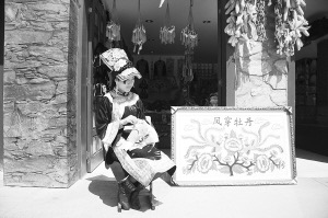 午后,張國(guó)麗文文靜靜地坐在店前刺繡,繡帕上是一對(duì)鮮活的鴦鴦?!盀t灑、飄逸、俊秀是張國(guó)麗刺繡創(chuàng)作的風(fēng)格,許多來旅游的人都是這樣評(píng)價(jià)的。她獨(dú)樹一幟,盡情彰顯了羌風(fēng)羌韻?!痹樠鄧?yán)肅認(rèn)真地解說。