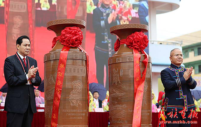 廣西壯族自治區(qū)代表團向環(huán)江縣贈送民族團結寶瓶(左為廣西壯族自治區(qū)代表團團長,中共廣西壯族自治區(qū)黨委常委、政法委書記黃世勇,右為中共環(huán)江毛南族自治縣委書記黃榮彪)