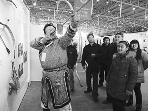 日前,在北京舉行的非遺生產(chǎn)性保護成果大展上,幾名觀眾圍攏在一個身材魁梧的錫伯族老人周圍,但見他身罩長袍,足踏薄底靴,雙目圓睜,兩臂運力搭弓上箭,儼然就是準備步射的驍將。這位老人就是錫伯族傳統(tǒng)弓箭技藝傳承人伊春光,老漢手中的弓重近1公斤,是他親手制作的。