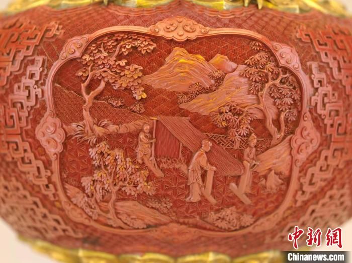 沈陽(yáng)故宮博物館敬典閣館藏珍寶展展廳展出的乾隆款剔紅開(kāi)光山水人物紋龍耳瓶。 沈陽(yáng)故宮博物館供圖