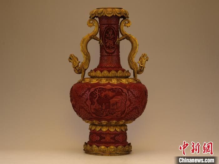 沈陽(yáng)故宮博物館敬典閣館藏珍寶展展廳自端午假期開(kāi)始展出乾隆款剔紅開(kāi)光山水人物紋龍耳瓶。沈陽(yáng)故宮博物館相關(guān)負(fù)責(zé)人15日表示,此文物反映了清代盛世的審美趣味,展現(xiàn)了中華文明之美。