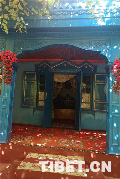 除了古老的純木質(zhì)結(jié)構(gòu)民宿,喀贊其還有各式磚石結(jié)構(gòu)的民居。院落寬敞明亮、華麗氣派,家家種植著花草、蔬菜,郁郁蔥蔥、生機盎然,葡萄廊架已成為每家的“標(biāo)配”,葡萄架下是家人休閑、朋友聚會的地方。圖為當(dāng)?shù)孛窬釉簝?nèi)。