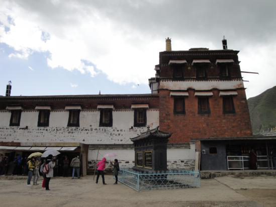在狹長(zhǎng)的盆地上,各式建筑星羅棋布,金瓦紅墻,雕梁畫(huà)棟,華麗非凡。僅圍墻就長(zhǎng)達(dá)3公里余。五百多間連續(xù)回廊及一千多個(gè)“嘛呢轱轆”,將寺院與外界隔絕。整個(gè)寺院外部墻垣、院地、臺(tái)階均以石砌為主,內(nèi)部戶(hù)限、柵欄、棟梁、門(mén)栓均以木料為主,故有“寺院外不見(jiàn)木,內(nèi)不見(jiàn)石”的說(shuō)法。