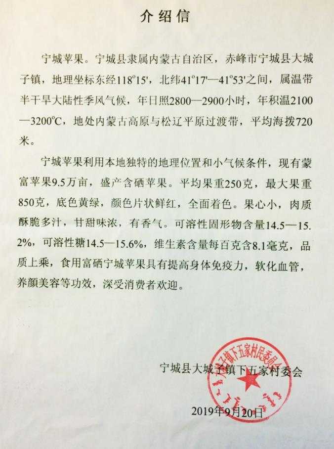 寧城蘋果是寧城縣巴林果樹試驗場與沈陽農(nóng)業(yè)大學合作,于1978年以哈爾濱東光蘋果為母本和日本富士蘋果為父本雜交而來,經(jīng)過十幾年時間選育而成的蘋果。1997年內(nèi)蒙古自治區(qū)科學委員會組織國內(nèi)著名果樹專家進行鑒定,定名為蒙富,寓意內(nèi)蒙古的富士。2015年7月“寧城蘋果”通過國家工商總局商標局注冊,取得“寧城蘋果”地理標志證明商標,推動了本地蘋果產(chǎn)業(yè)健康快速發(fā)展。