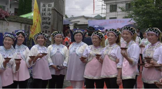 布依族青年們抬著族中神物銅鼓,吹著長長的號角,臉上滿是對民族節(jié)日的期待之情,驕傲又興奮;成群結(jié)隊(duì)的孩童穿著本民族傳統(tǒng)服飾,手拿錦帶,熱忱歡迎遠(yuǎn)道而來的客人;能歌善舞的布依阿姐笑臉相迎,唱著布依族的歌謠,一字排開堵在門前,客人們想要進(jìn)去參加這次盛會,就得過三關(guān),干了三碗攔路酒。