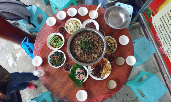 喝罷三碗阿姐手中的米酒,這滿桌的美食就等著動箸了。長桌宴席的主菜,即是為了“六月六”祭祀而宰的牛。那一大盆牛肉堆積如山,面上灑滿薄荷,清香四溢,味美量足,一桌人都吃不完。一方面足見布依人民的豪爽,另一方面也許是為了大家相聚的時間更多,在餐桌上把酒言歡。