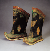 蒙古人愛穿靴子,蒙古靴分布靴和皮靴兩種。布靴多用厚布或帆布制成,穿起來柔軟、輕便。皮靴多用牛皮、馬皮或驢皮制成,結(jié)實(shí)耐用,防水抗寒性能好。其式樣大體分靴尖上卷、半卷和平底不卷的三種,分別適宜在沙漠、干旱草原和濕潤(rùn)草原上行走。蒙古靴做工精細(xì)考究,靴幫、靴靿上多繡制或剪貼有精美的花紋圖案。
