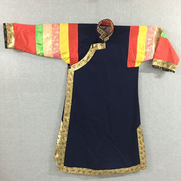 民族文化宮博物館收藏的這件立領(lǐng)右衽大襟五色袖“彩虹衣”,是土族女子盛裝時(shí)的一種服飾,征集于青海省互助土族自治縣。年代為20世紀(jì)30年代?!安屎缫隆遍L(zhǎng)117厘米,胸圍120厘米,袖長(zhǎng)59厘米,棉質(zhì)。整件女服右衽大襟,藍(lán)棉布襯里,左右側(cè)開(kāi)衩,黑色“拉花”立領(lǐng),領(lǐng)上以土族傳統(tǒng)刺繡工藝—盤(pán)繡刺繡紅綠相間圓形圖案和辮形線(xiàn)條,綴三枚金色圓銅扣。衣袖為紅、黃、綠、白、粉五色彩布、彩緞拼接的“彩虹袖”,其中紅色為主色,占整個(gè)衣袖約一半面積,其余四色布?jí)K相鄰,均勻分布于衣袖上方,布?jí)K上刺繡有金色梅、蘭、竹、菊?qǐng)D案。衣袖袖口鑲寬約3厘米黑色絲絨底刺繡花邊,花邊里外均繡有花草紋樣,做工精致?;ㄟ吷辖訉捈s10厘米金色牡丹紋花邊,與襟邊、下擺、衩口等處所貼金色牡丹紋花邊相互呼應(yīng),極富設(shè)計(jì)感。