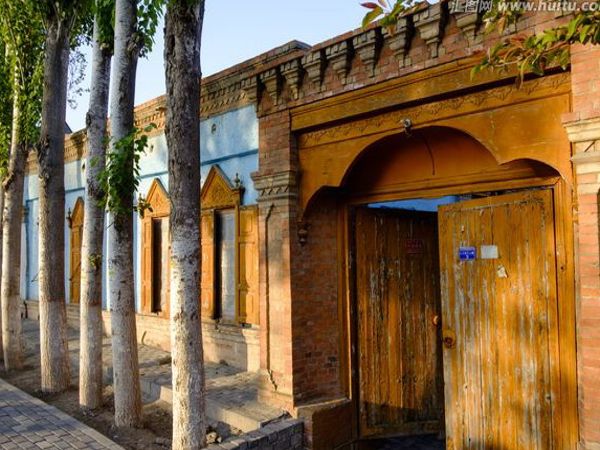 維吾爾族的居室一般是土木結(jié)構(gòu)平房,其建筑方式是以粗木或沙石作基,土塊砌墻,或笆子墻,房頂架梁檁、椽后鋪葦席加土抹泥。房屋平頂,開天窗采光,四壁不開窗只留門,房門忌朝西。現(xiàn)在,建筑式樣發(fā)生變化,多留壁窗,建材也多由土木結(jié)構(gòu),向磚、混凝土結(jié)構(gòu)發(fā)展。室內(nèi)布置過去較為簡(jiǎn)單,一般多砌土炕,炕一側(cè)隔矮墻砌鍋臺(tái),墻上留有壁翕,放置物品,喜掛壁毯。冬季多燒爐子、火墻取暖。院內(nèi)多植有葡萄和果樹花卉。房門口兩側(cè)砌土臺(tái),上鋪氈毯,用以夏天乘涼、睡覺。