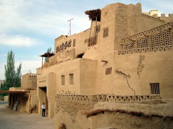 維吾爾族的傳統(tǒng)民居多為帶有地下室,農(nóng)家還用土胚塊砌成晾制葡萄干的鏤空花墻的晾房。住宅一般分前后院,后院是飼養(yǎng)牲畜和積肥的場(chǎng)地,前院為生活起居的主要空間,院中引進(jìn)渠水,栽植葡萄和杏等果木,葡萄架既可蔽日納涼,又可為市場(chǎng)提供豐盛的鮮葡萄和葡萄干。信仰伊斯蘭教的民族喜好清潔,很重視沐浴,特別講求水源的潔凈。在沒有渠水可引的地方,幾乎每戶都在庭院自打一口井,并嚴(yán)格保護(hù)水源,使其不受污染。