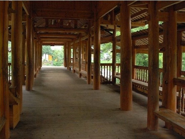 風(fēng)雨橋以石拱木作,廊、屋、亭、閣為一體,造型別致、美不勝收。無論是遠(yuǎn)眺還是進(jìn)觀,都體現(xiàn)出獨(dú)特的審美意境。鏈接廊橋與屋亭的是長(zhǎng)條青石,橋與村寨的連接則用花石鋪路,橋面主體是當(dāng)?shù)厮寄静摹_@種自然生態(tài)環(huán)保的理念,更彰顯了瑤族人民獨(dú)特的審美境界。