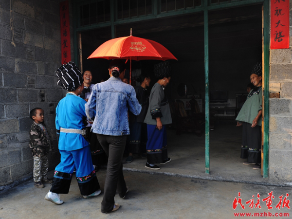 姑娘出嫁必須有娘家人陪送,婚禮這一天清早,“新娘”便在“接親客”的帶領(lǐng)和送親隊(duì)伍的陪同下,一路歡聲笑語(yǔ) ,浩浩蕩蕩向“新郎”家走來(lái)。走到新郎家村邊,有的燃放鞭炮,一直燃放到新郎家門口,請(qǐng)新郎父母出來(lái)開(kāi)門;無(wú)鞭炮準(zhǔn)備的,則在寨邊稍候,由迎親伙伴飛報(bào)新郎家做好迎親的準(zhǔn)備。男方父母聽(tīng)到后,多數(shù)是很高興地喊醒家中兒女,由新郎的妹妹或堂姐妹為迎親主體,加上寨上的姐妹和房族組成迎親隊(duì)伍,打開(kāi)大門,把新娘迎進(jìn)家來(lái)。接親的主要儀式是接傘。接傘的人必須是新郎的小妹或堂妹。無(wú)親妹、堂妹者則由新郎父母指定一與新郎同輩份的小姑娘去接。新娘走至大門,即由新郎的妹妹跨出門外迎接新嫂子,新嫂子接著用左手把雨傘遞給接傘的妹妹,接傘妹妹接過(guò)新嫂子手中的雨傘后,新娘即用左腳跨進(jìn)屋內(nèi),以示今后成為新家庭的主婦。隨即由接傘妹妹攜新娘手迎入新房,迎親婦女們陸續(xù)進(jìn)入新房休息。入門后,新郎家的“陪娘”及姑娘們便熱情地安排“送親客”團(tuán)團(tuán)圍坐,并簇?fù)碇靶履铩本o靠堂屋中柱子就坐,意為“新娘”從此當(dāng)家立業(yè),將來(lái)就像中柱子一樣,頂大梁,撐起這個(gè)家。