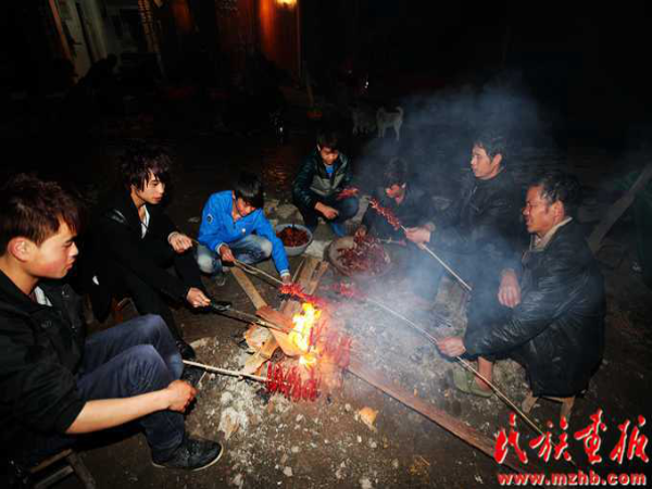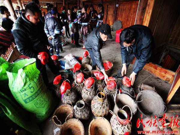 這次結(jié)婚的共有15對(duì)新人(多時(shí)有二三十對(duì)),均來自本寨的青年男女。婚禮從大年二十六開始,共進(jìn)行三天,在三天的婚禮中新郎新娘家均有婚宴,尤以第一天中午的規(guī)模最大也最為隆重。