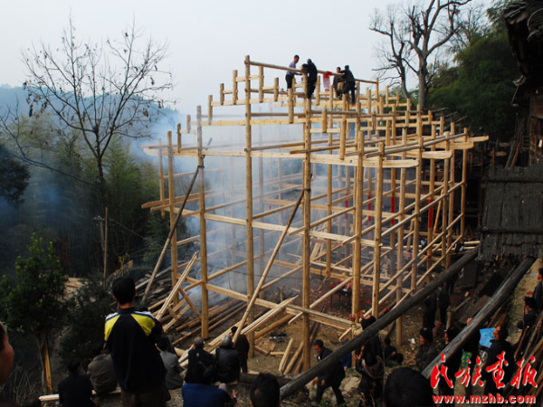 建房是人生中的一件大事,同時也有許多講究和說法。準備建房材料時首先要選取上乘的中柱。在砍伐中柱時需準備香燭、紙錢、酒、魚、糯米飯到樹下祭奠,主人先砍幾斧,再由其他親友砍伐。備好的材料經曬干、推刨后由木匠發(fā)墨。發(fā)墨時主人在木柱一端執(zhí)線,木匠在柱上拉直用力一彈,墨線筆直均勻,則表示吉利,否則還要重新發(fā)墨。立房是家中的一件大事。一般立房架和上梁同日進行,屆時族人都會來幫忙,他們齊心協力把新房立起來,來參加立房架儀式的親戚朋友都會帶禮品來慶賀。立大門時要殺一只公雞祭祀。待蓋房、裝飾等完成之后再擇吉日喬遷。