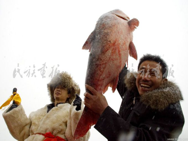 “祭湖”結束后, “魚把頭”帶領幾位漁工在剛才祭湖的冰面上,用冰镩鑿開一個1米左右的冰洞,“魚把頭”拿著抄撈子,在冰洞里攪和幾下,使勁往上一揚,只見一條活蹦亂跳的胖頭魚就被 撈出水面。經(jīng)過磅秤,重32斤,稱為“開湖頭魚”。經(jīng)過幾輪叫賣,這條“頭魚”以人 民幣8888元的價格被一位廣東來的游客買走。