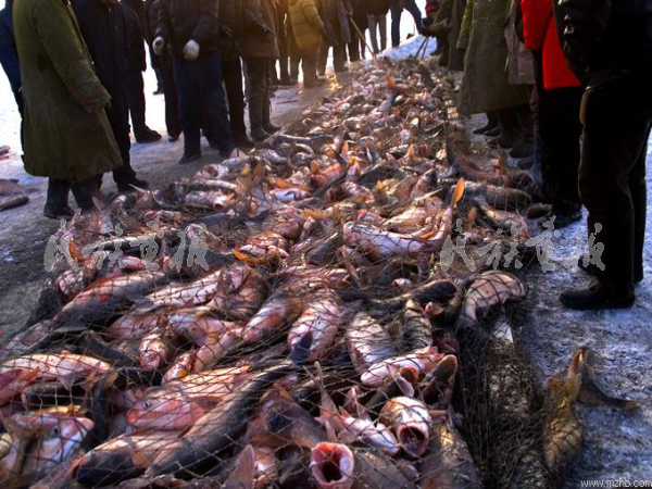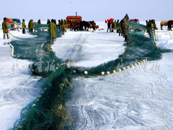 隨著“魚把頭”高亢的號子,馬拉人拽,一張幾千米長的大網(wǎng),被緩緩地拉出冰面。鯉魚、鯽魚、鰱魚、鯰魚等各種魚類一群一群翻上了冰眼。轉眼之間,冰面上堆起了一個個魚垛。