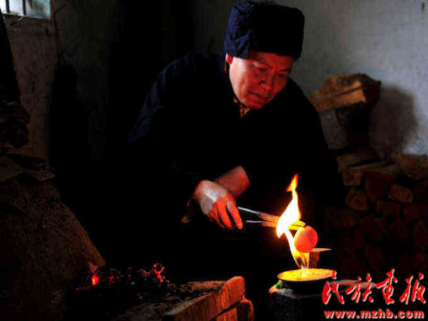莫師傅在對兩個蘆笙進行高低音的和諧調(diào)試