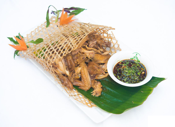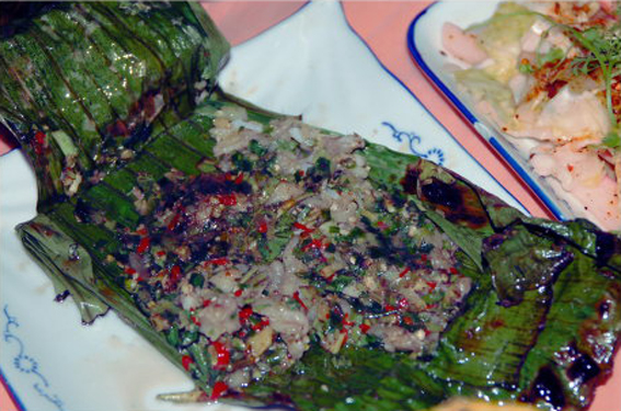 傣族傳統(tǒng)家常風(fēng)味菜,特點是軟嫩鮮甜,原汁原味。制法是將鮮魚去鰓和內(nèi)臟,洗凈,將蔥花、姜末、蒜末、青椒末、青姜葉末、芫荽末、野花椒葉末、薄荷、茴香葉末、香茅草葉末、草果粉、味精、鹽、料酒拌制成餡,裝入魚腹,頭尾折攏,再用香茅草捆成十字,外面包以芭蕉葉,埋入木柴燒后的炭或熱灰中燒熟,取出去掉芭蕉葉和香茅草,裝盤即成。
