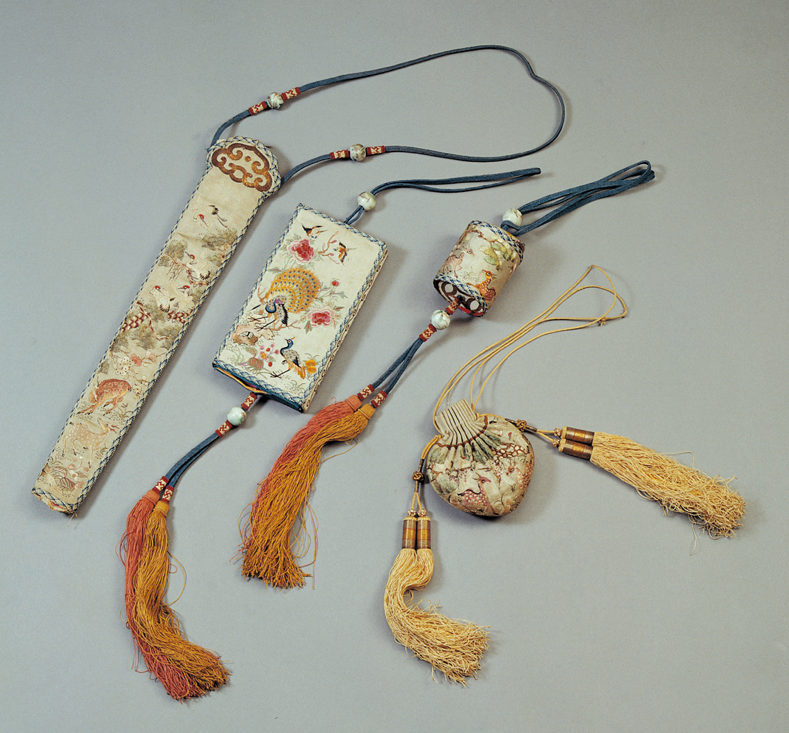 滿族服飾色彩多以淡雅的白色、藍(lán)紫色為主,紅、粉、淡黃、黑等色也是其服飾的常用色。白色在滿族服飾中是一個(gè)重要的顏色,因?yàn)?,滿族傳統(tǒng)上有尚白習(xí)俗,以白色為潔、為貴,白色象征著吉祥如意,所以,在滿族服飾中常在紅色、藍(lán)色等其他顏色的旗袍上鑲白色的花邊。滿族男女都喜愛(ài)在腰間或衣服的大襟上掛佩飾。男子有火鐮、耳勺、牙簽、眼鏡盒、扇帶。滿族女子喜歡盤頭翅,梳兩把頭或旗髻,戴耳環(huán)、手鐲、戒指、頭簪、大絨花和鬢花等各種裝飾品。擅長(zhǎng)刺繡,她們?cè)谝陆蟆⑿?、香囊、荷包、枕頭等物品上刺繡花卉、芳草、鶴鹿、龍鳳等吉祥圖案(圖為滿族清代繡花湖色緞佩飾,中央民族大學(xué)民族博物館館藏)。