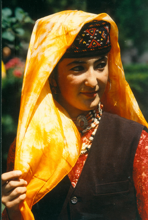 塔吉克族婦女服飾的顏色艷麗而奪目,大多數(shù)會以紅色為主,她們喜歡穿連衣裙,并在裙邊、領(lǐng)口、袖口上繡以美麗的花紋或者圖案,還喜歡用耳環(huán)、項鏈、手鐲等首飾來裝扮自己。她們十分講究頭飾和帽子,有一種青年婦女的圓形花帽上會嵌鑲金、銀片和各種珠子,帽子前沿會裝飾一排色彩鮮麗的珠子、銀鏈。婦女著裝時帽沿上會加綴一排小銀鏈,在塔吉克語中稱為“斯拉斯拉”,戴著大耳環(huán),脖子山會繞數(shù)道項鏈,胸前還會佩戴被稱為“阿勒卡”的圓形大頭飾。通常情況下,已婚婦女會在發(fā)辮上綴飾白紐扣,新娘也會在發(fā)辮上飾以絲穗,以求美觀。在塔什庫爾干,打扮得花枝招展的塔吉克婦女隨處可見,猶如從天上云彩中下凡的仙女。塔吉克族已婚婦女的裝束也十分吸人眼球,她們外出時,會在帽子外披上頭巾,迎風走來,頭巾隨風飄揚,別有一番風度。