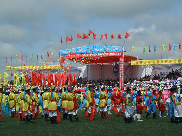 大草原最宜人的時節(jié)莫過于七八月。屆時,蒙古族牧民們,就會穿上盛裝,不管路途多遠(yuǎn),男女老少,舉家乘車騎馬,云集到綠海如茵的草原上。世界各地的游人也會紛至沓來,素日寧靜的草原頓時沸騰起來,藍天白云之下,彩旗飄揚,人流涌動,羊歡馬叫,呈一派繁榮景象。這就是蒙古民族一年一度的草原盛大節(jié)日——那達慕大會隆重開幕。